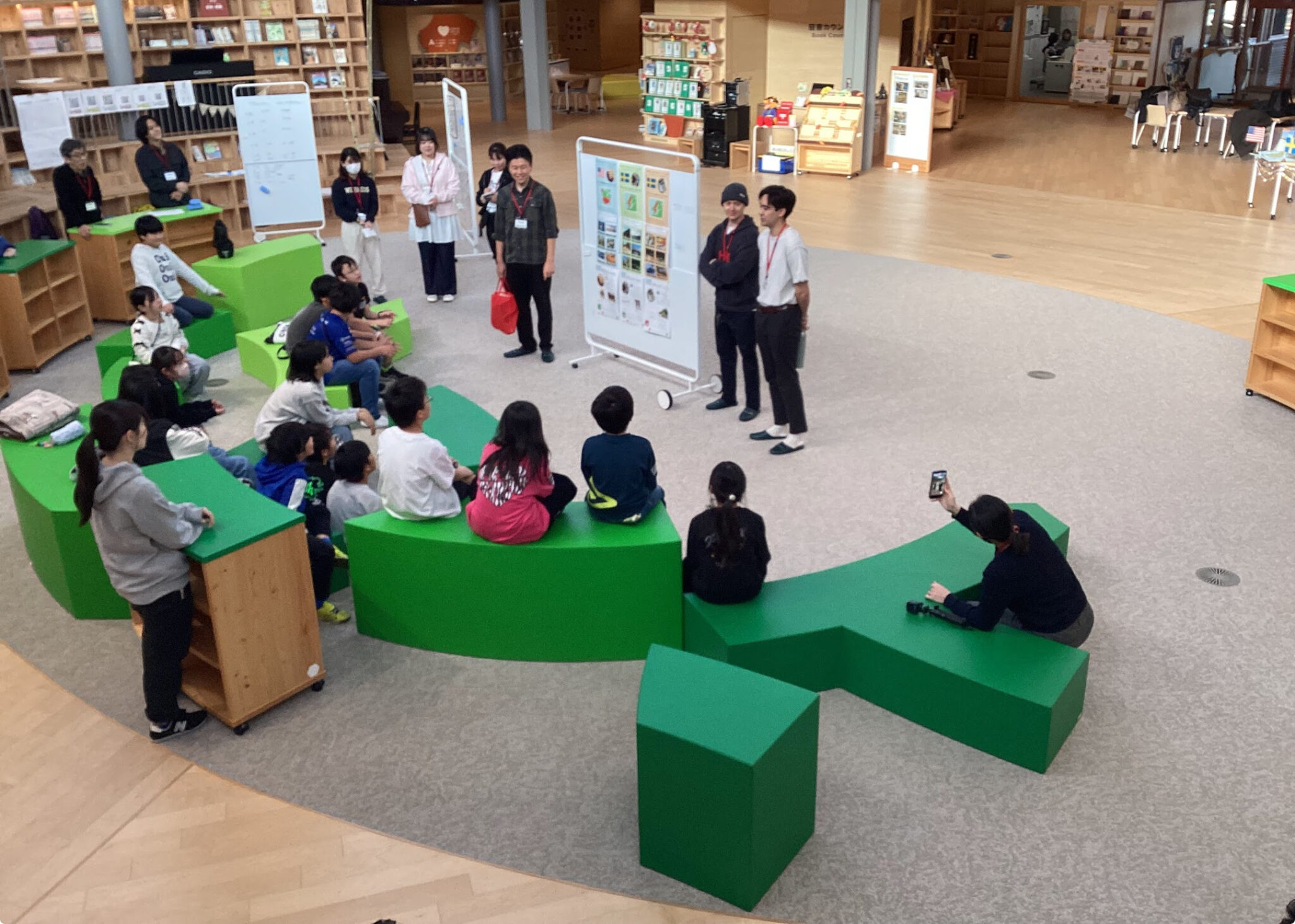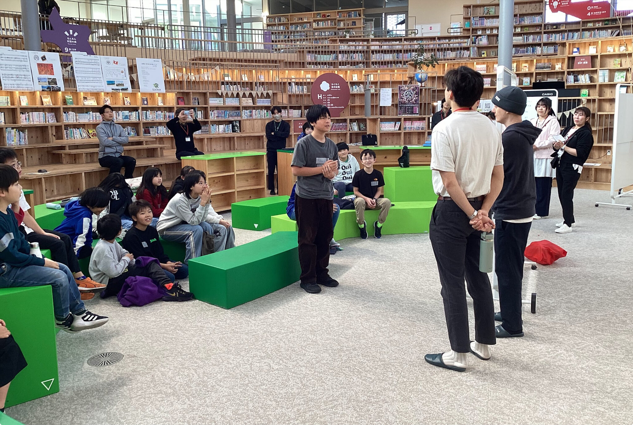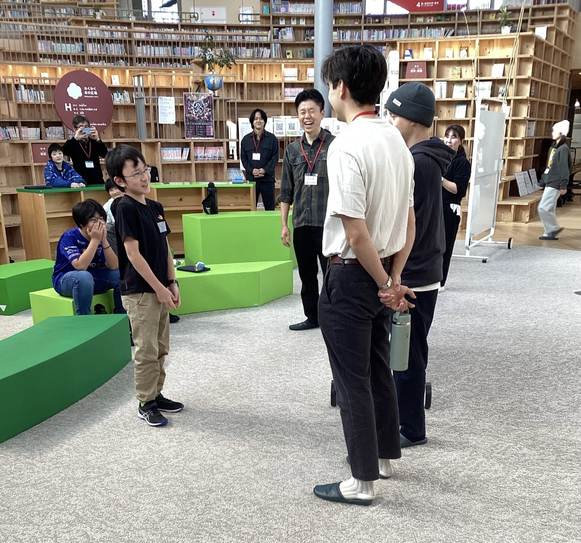 The students welcomed their guests at the Book Plaza with the greeting, “Welcome to Yumenomori,” and then guided them around the school in small groups.