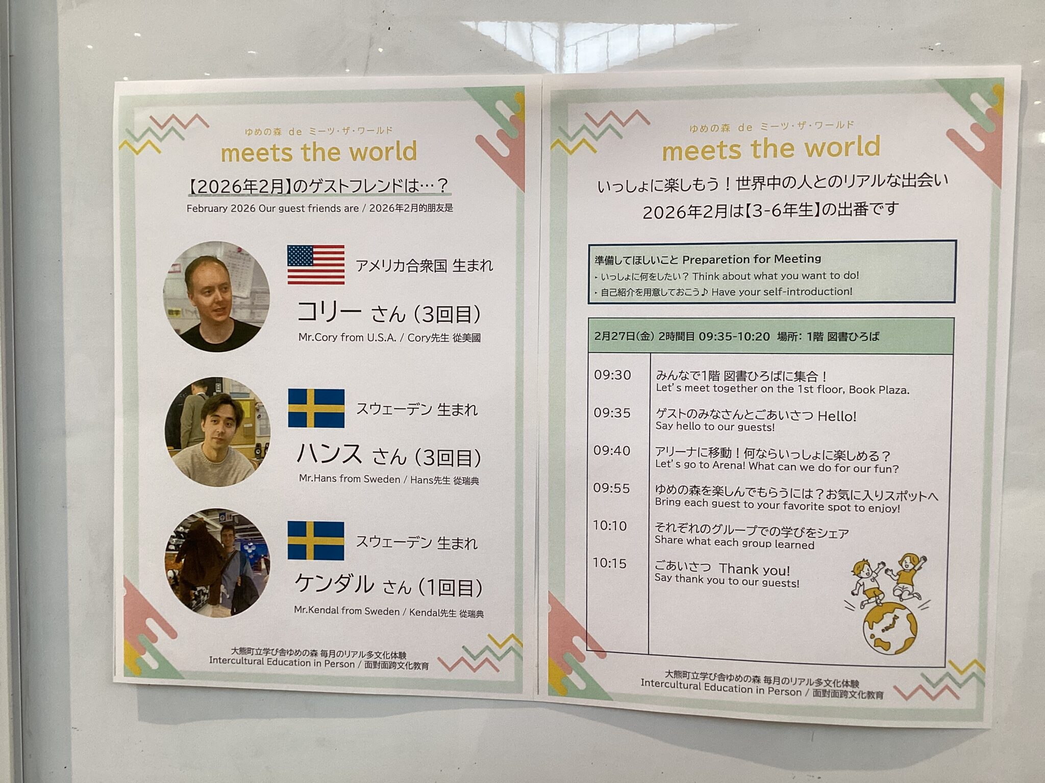 2月27日(金)のミーツ・ザ・ワールドは、今回もゆめの森に各国の方をお迎えして行われました。いつもは様々な国の人達とオンラインで繋がって行っていますが、今回は実際に会ってお話ができる!2回目の機会ということで始まる前から子どもたちのワクワクも高まっていました。