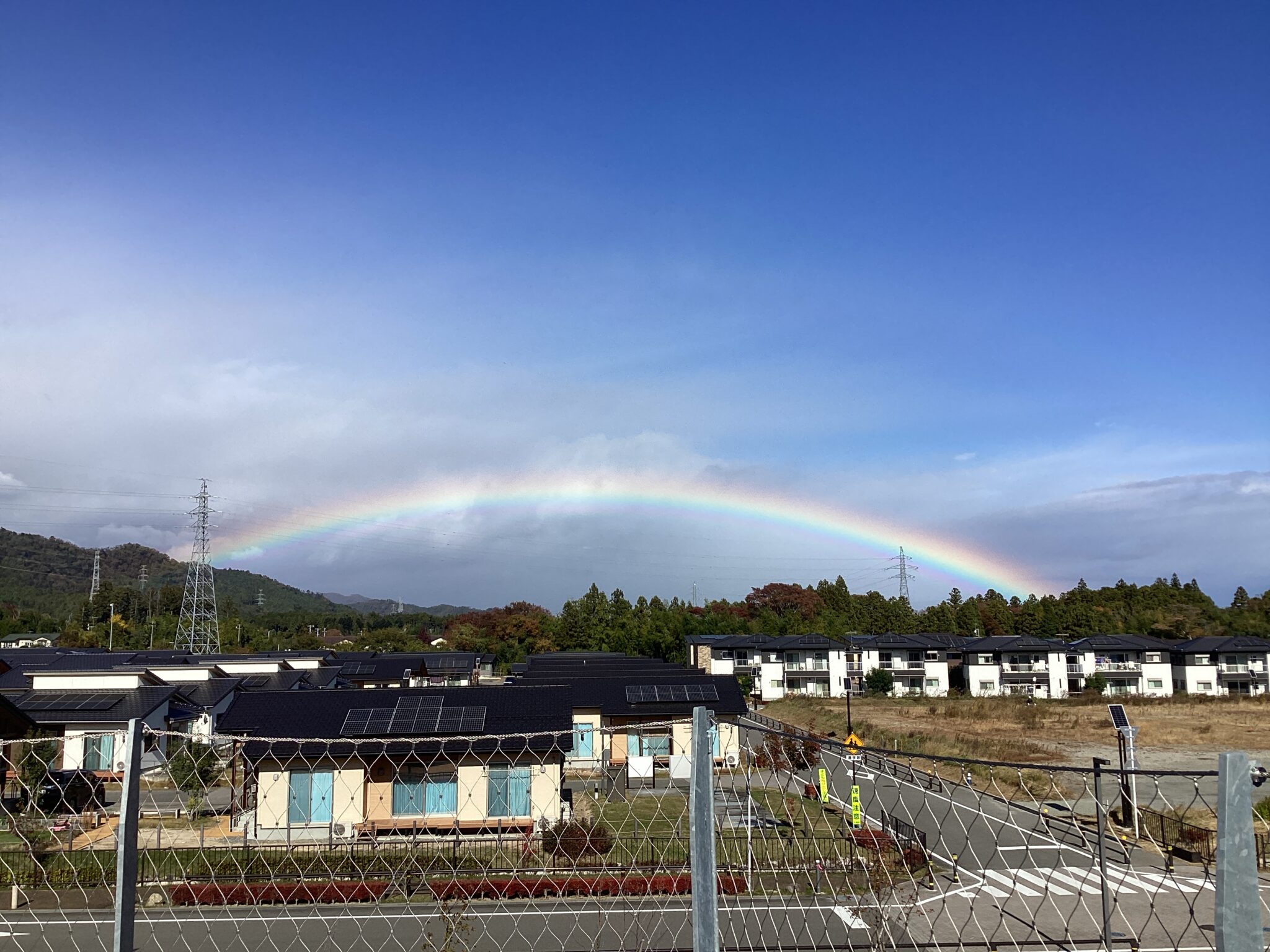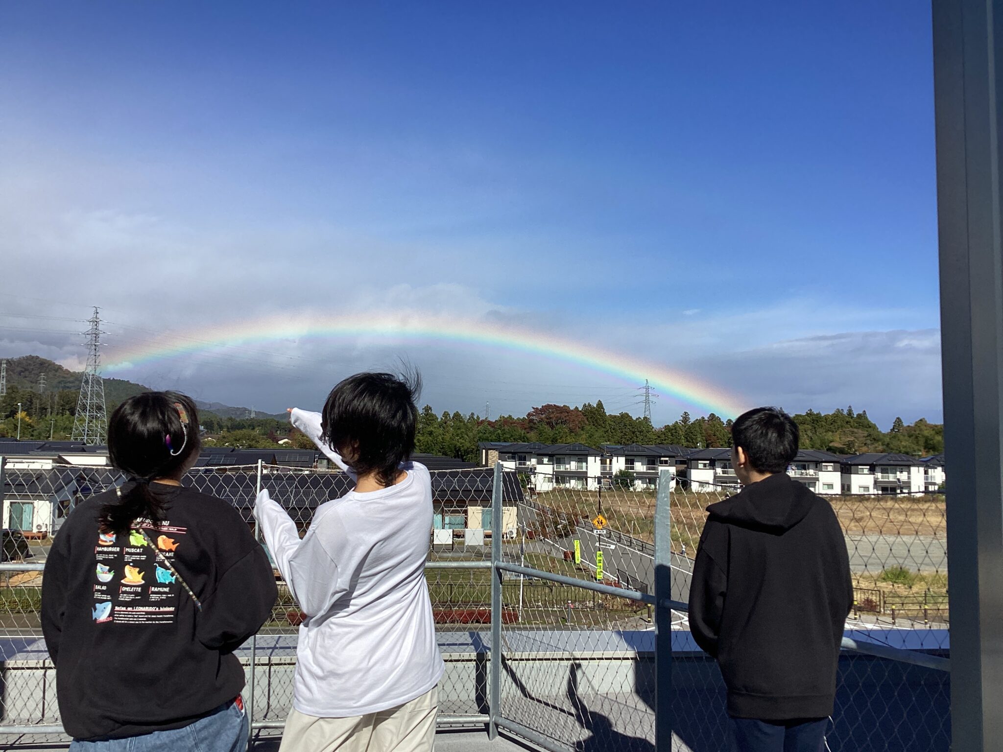 「虹ってなんでカラフルなの?」とキレイに現れた虹に目を奪われました。「外に出てもいいですか?」と屋上から眺め、自然が作り出す美しさに感動する瞬間でした。