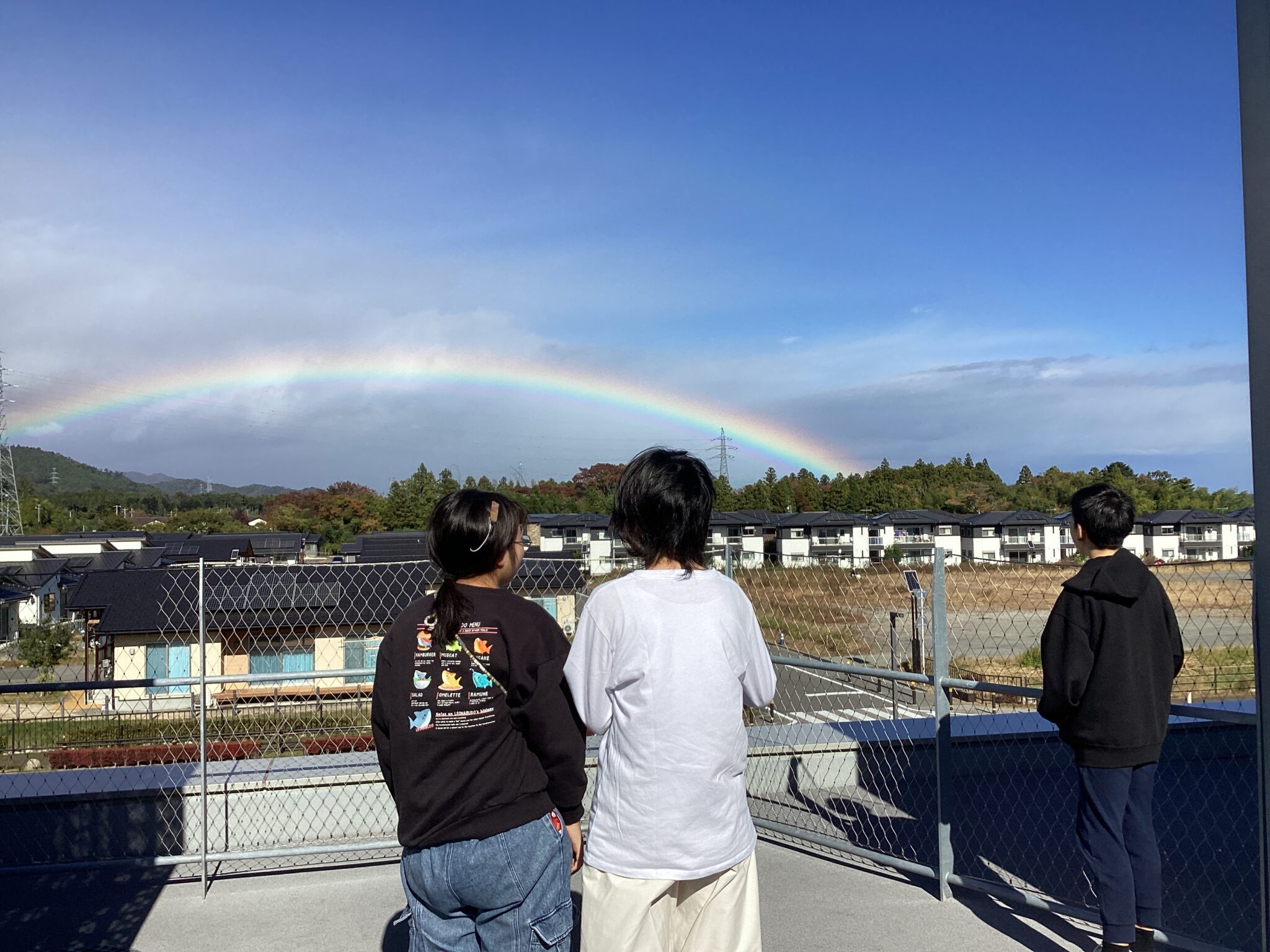 「虹ってなんでカラフルなの?」とキレイに現れた虹に目を奪われました。「外に出てもいいですか?」と屋上から眺め、自然が作り出す美しさに感動する瞬間でした。