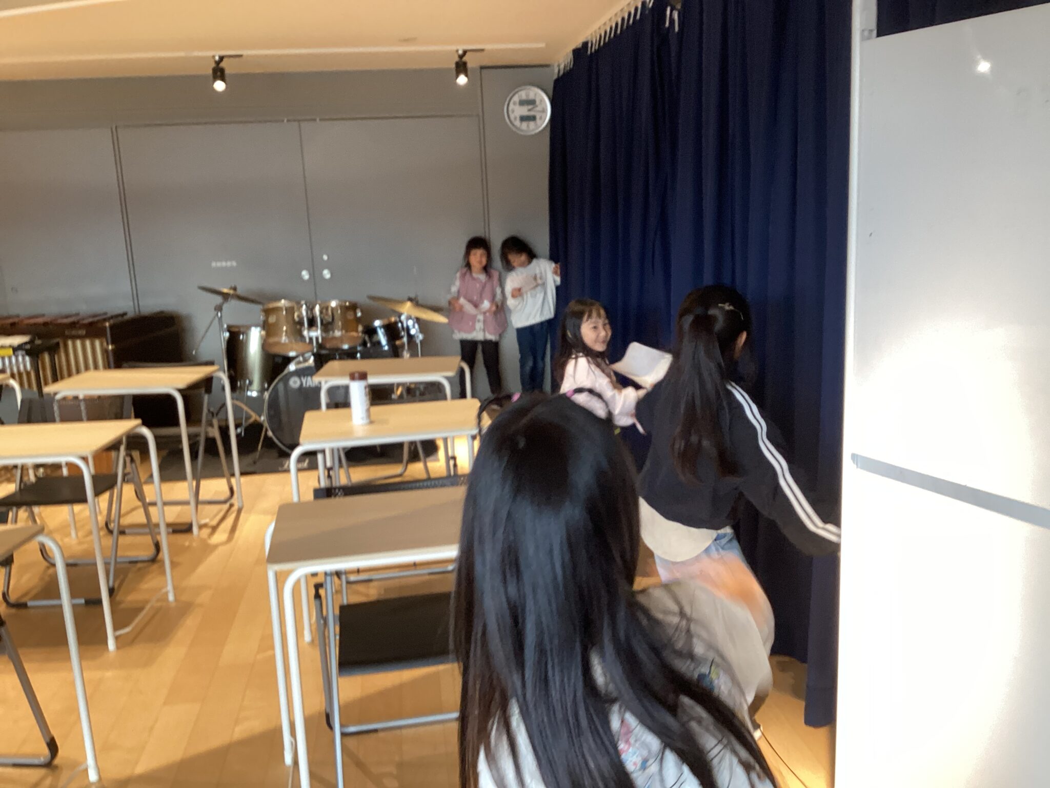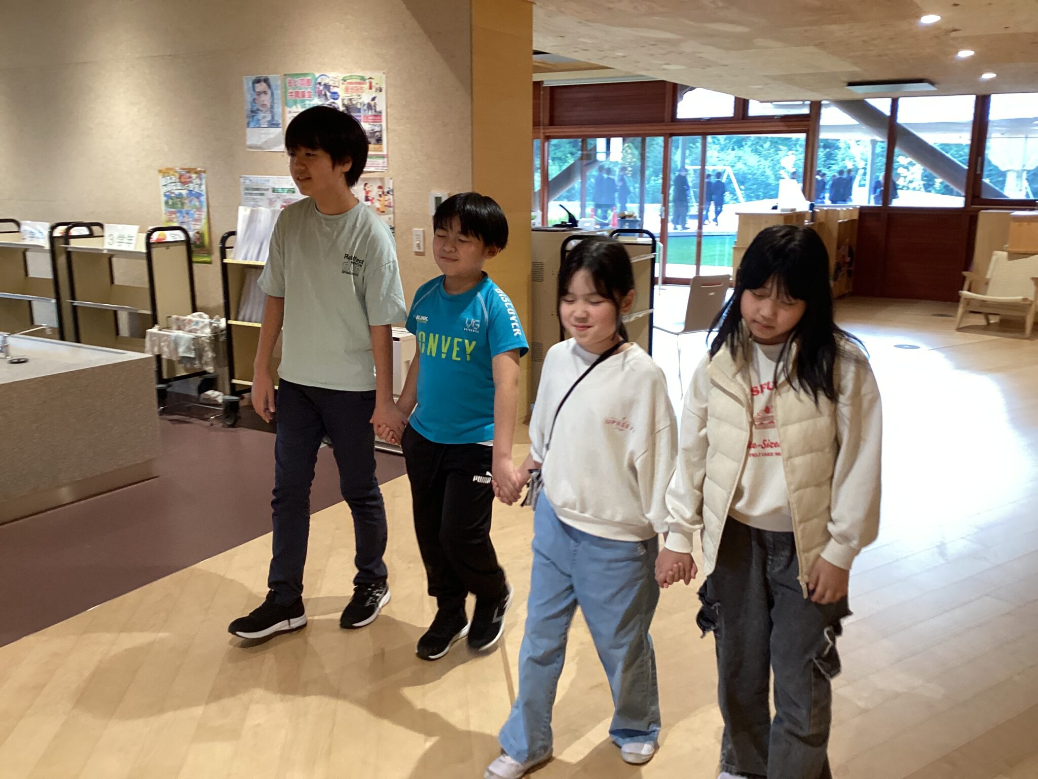 1、2年生は班に分かれて昔話を演じることに挑戦中。3〜6年生は班で“目隠し宝探し”に挑戦していました。手を繋いで校舎内を歩き、指示された物を探します。目を開けているのは班で1人だけ、その人が声をかけたり、手を引いたりしながらリードしていきました。後期課程はお題から動きやセリフを考えて演じました。