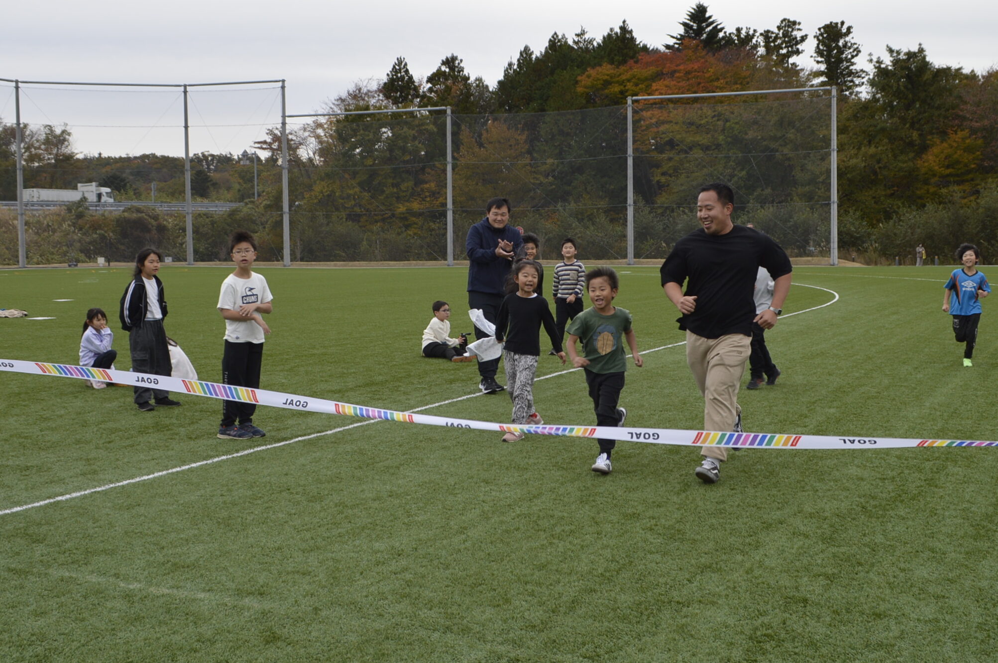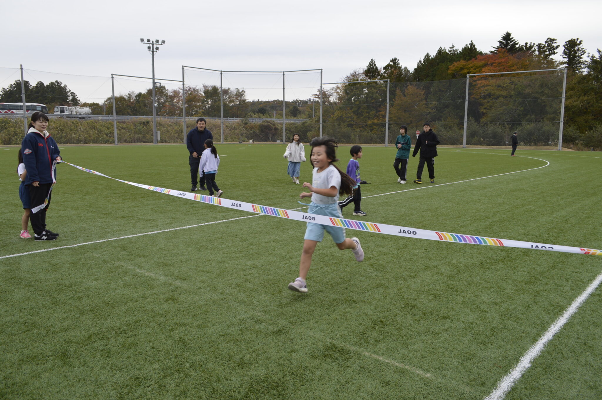 2年生がスタート!スタートの合図を真剣に聞いていました。後期課程は授業中でしたが、少しだけ応援に来てくれました。ゴールテープを持つお手伝いもしてくれました。