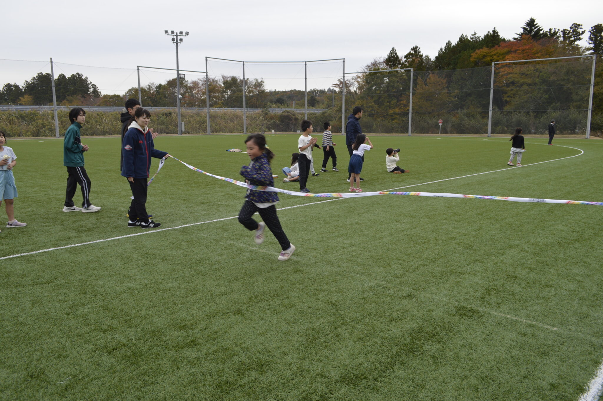 2年生がスタート!スタートの合図を真剣に聞いていました。後期課程は授業中でしたが、少しだけ応援に来てくれました。ゴールテープを持つお手伝いもしてくれました。