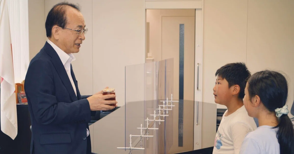 3年生は、自分の名刺をお渡しして自己紹介をしながらのご挨拶、町長さんからも名刺をいただきました。そして、昨日作ったいちごジャムをお渡しすることができました。みんなで作ったこと、自分たちもパンなどに塗って食べたことなどをお伝えしました。ぜひまた味の感想をお聞きしたいです。
