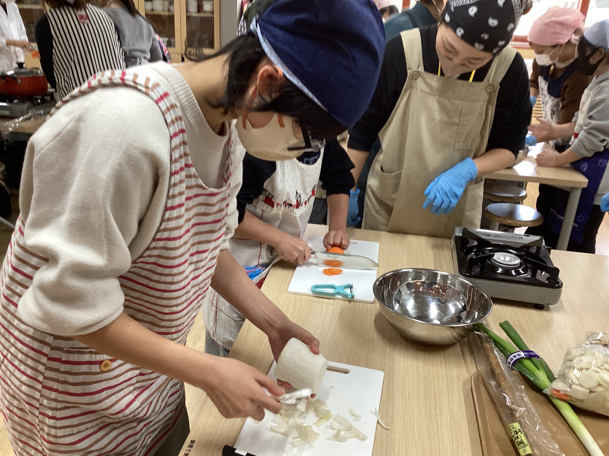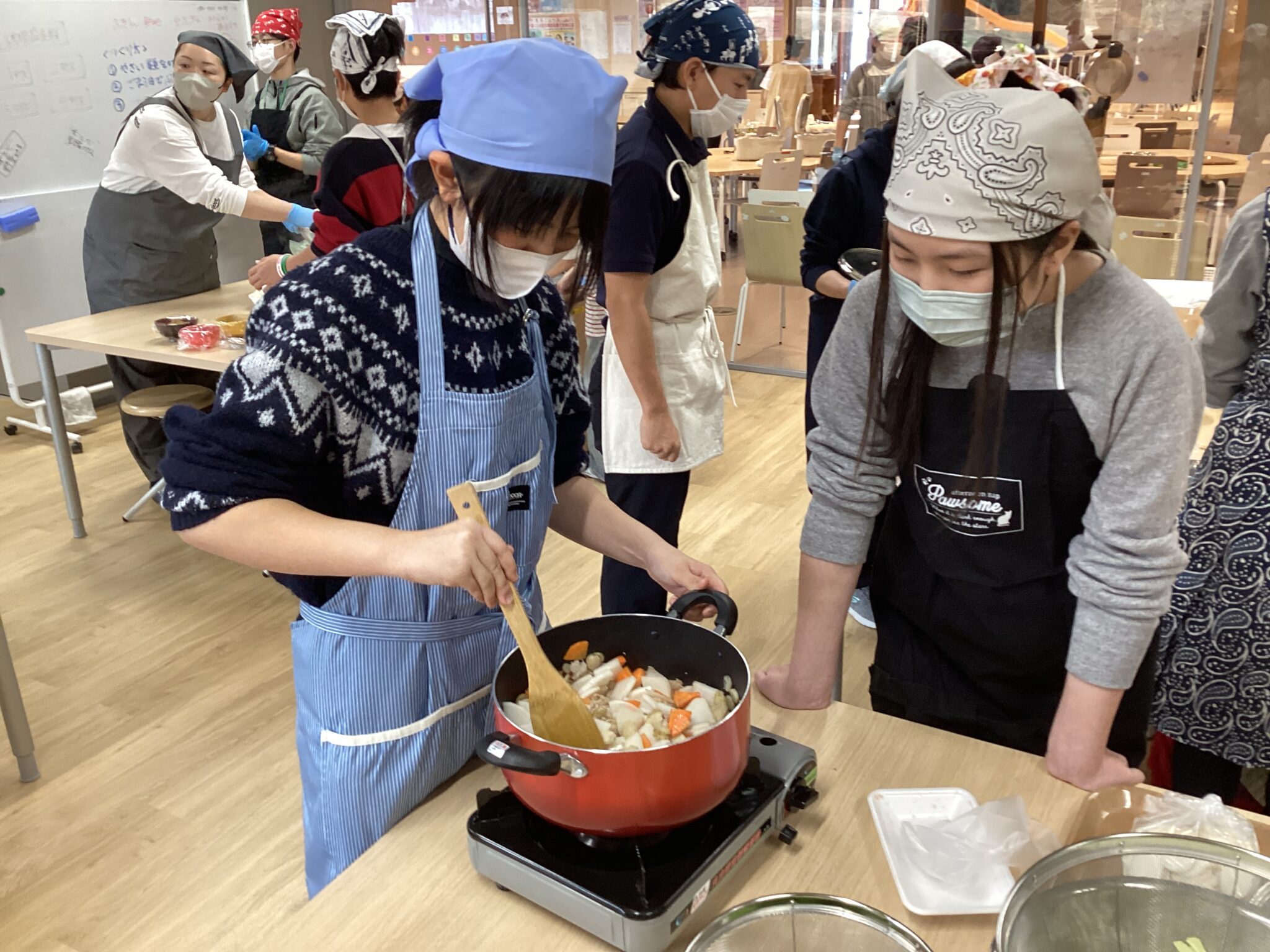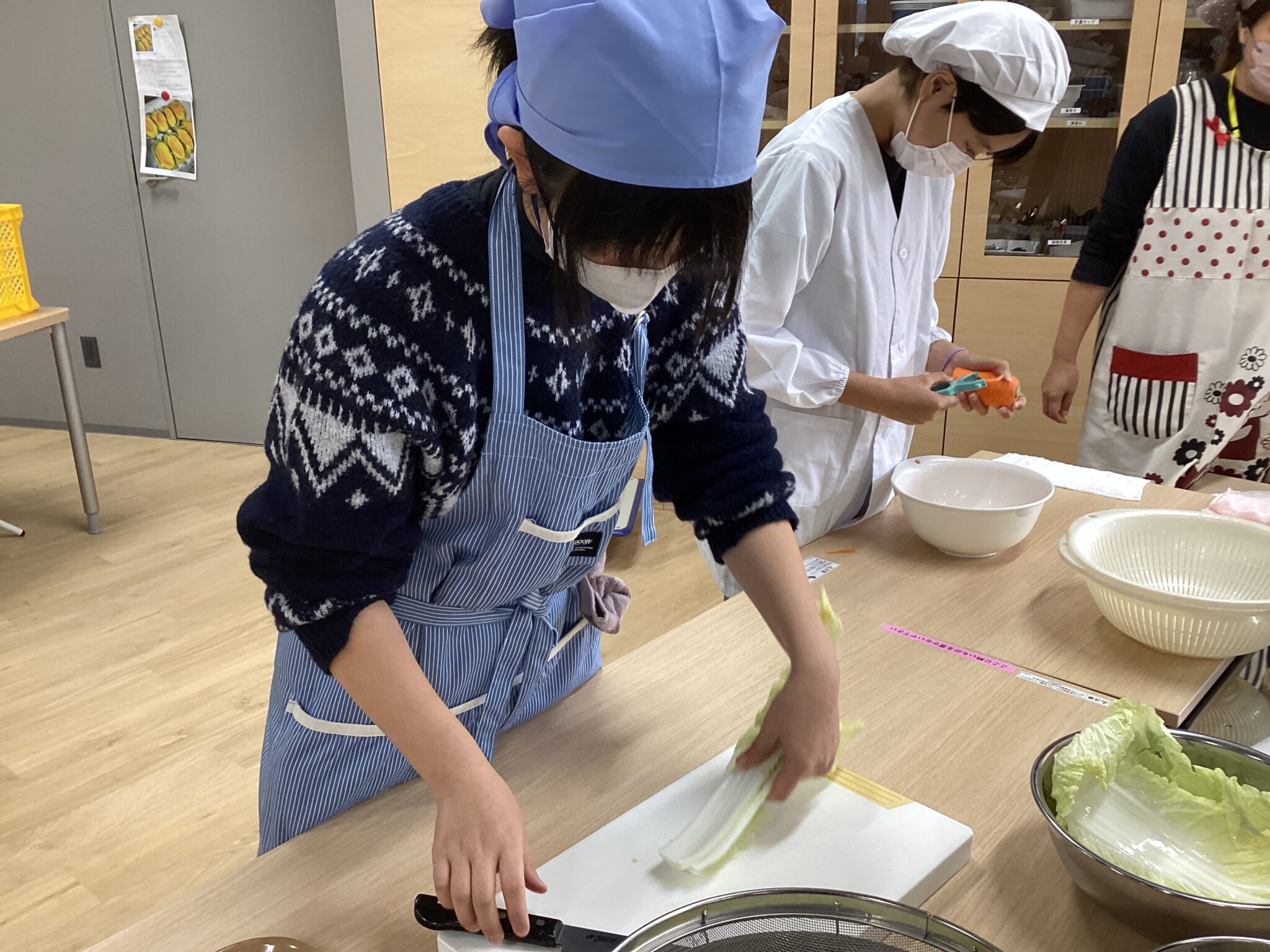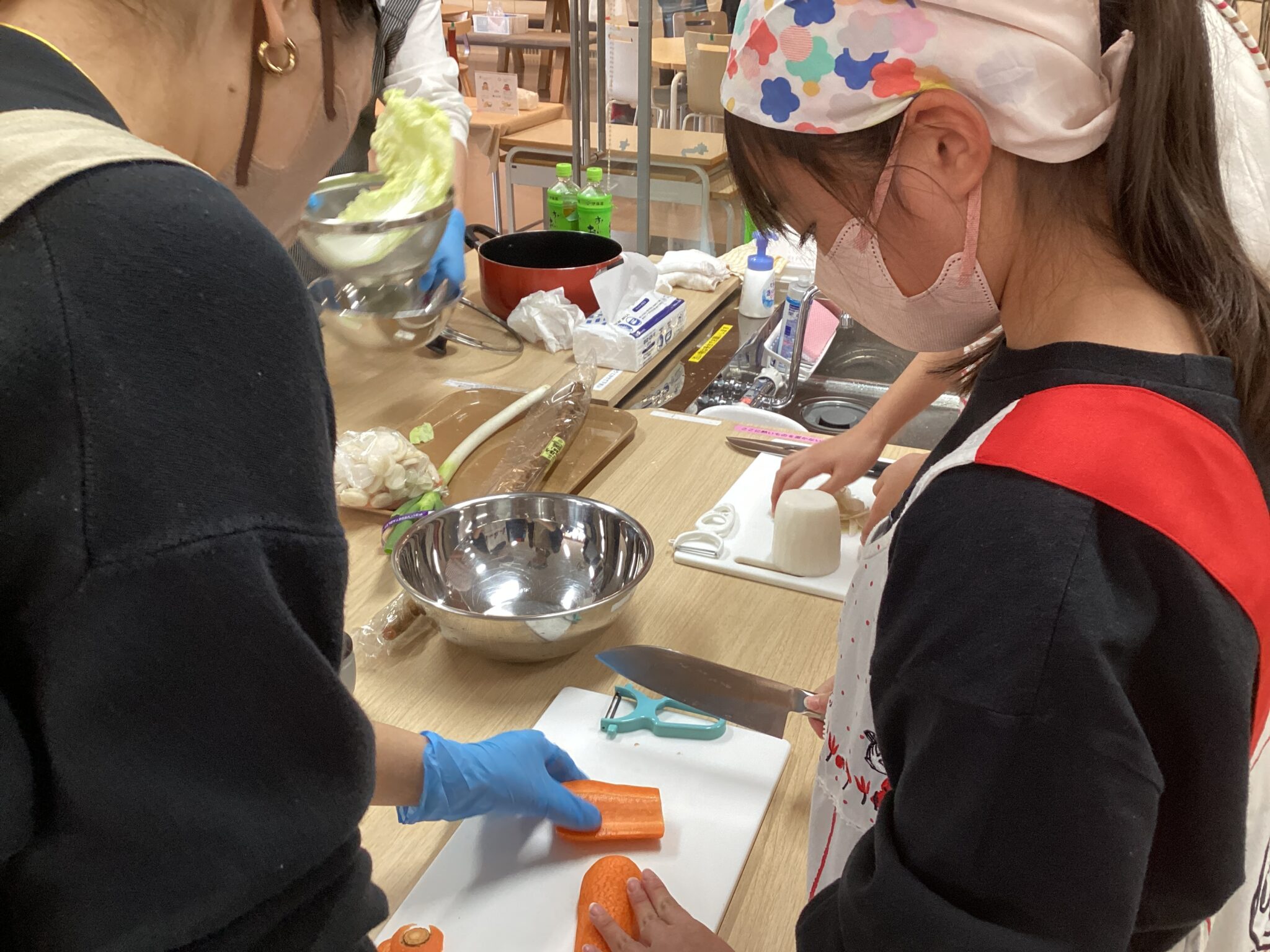 Thanks to the volunteers who started preparing the rice and vegetables and organizing the seasonings in advance, the 5th–9th grade students were able to start cooking smoothly. Meanwhile, the 1st–4th grade students practiced how to serve and welcome the guests.