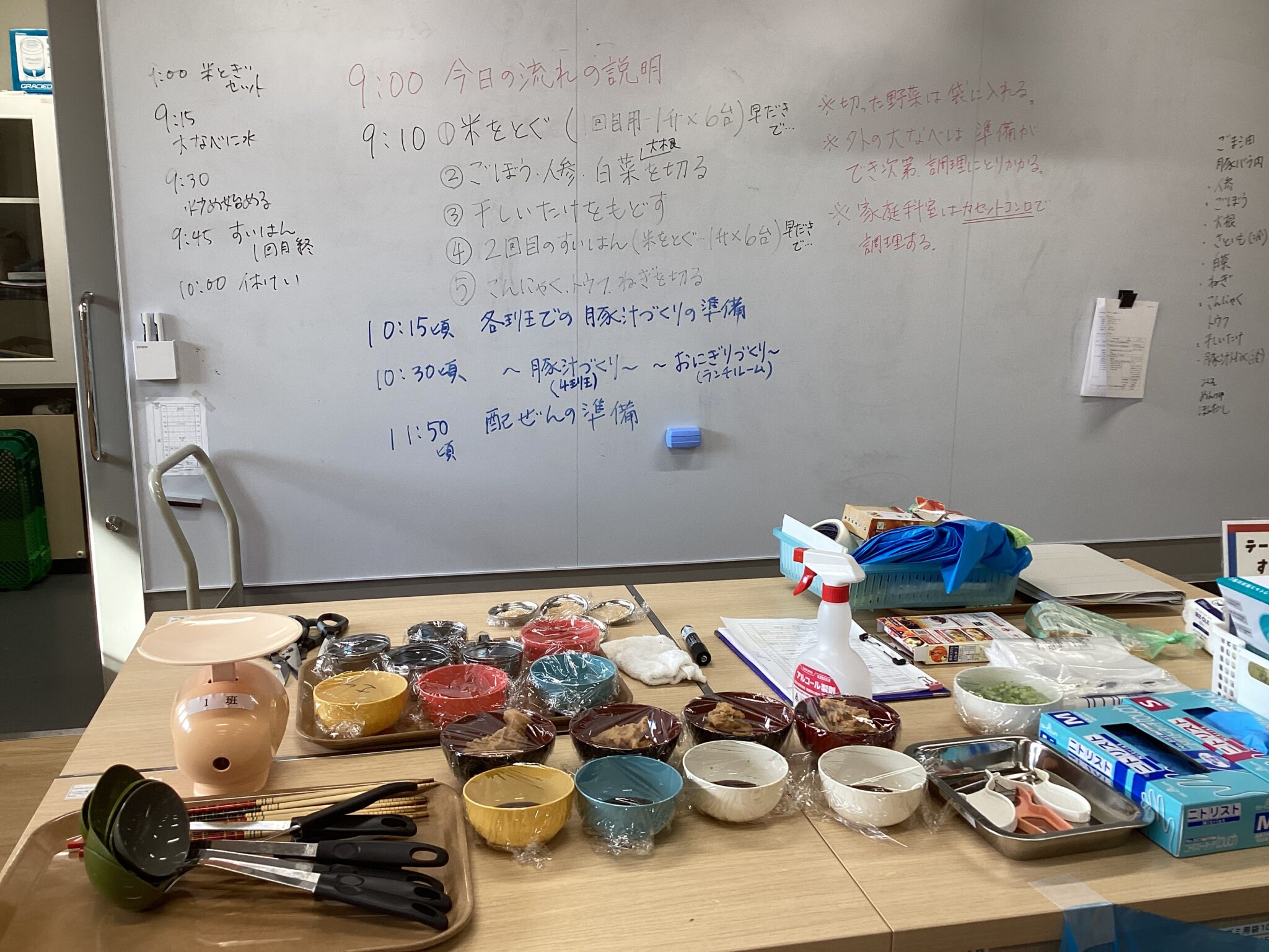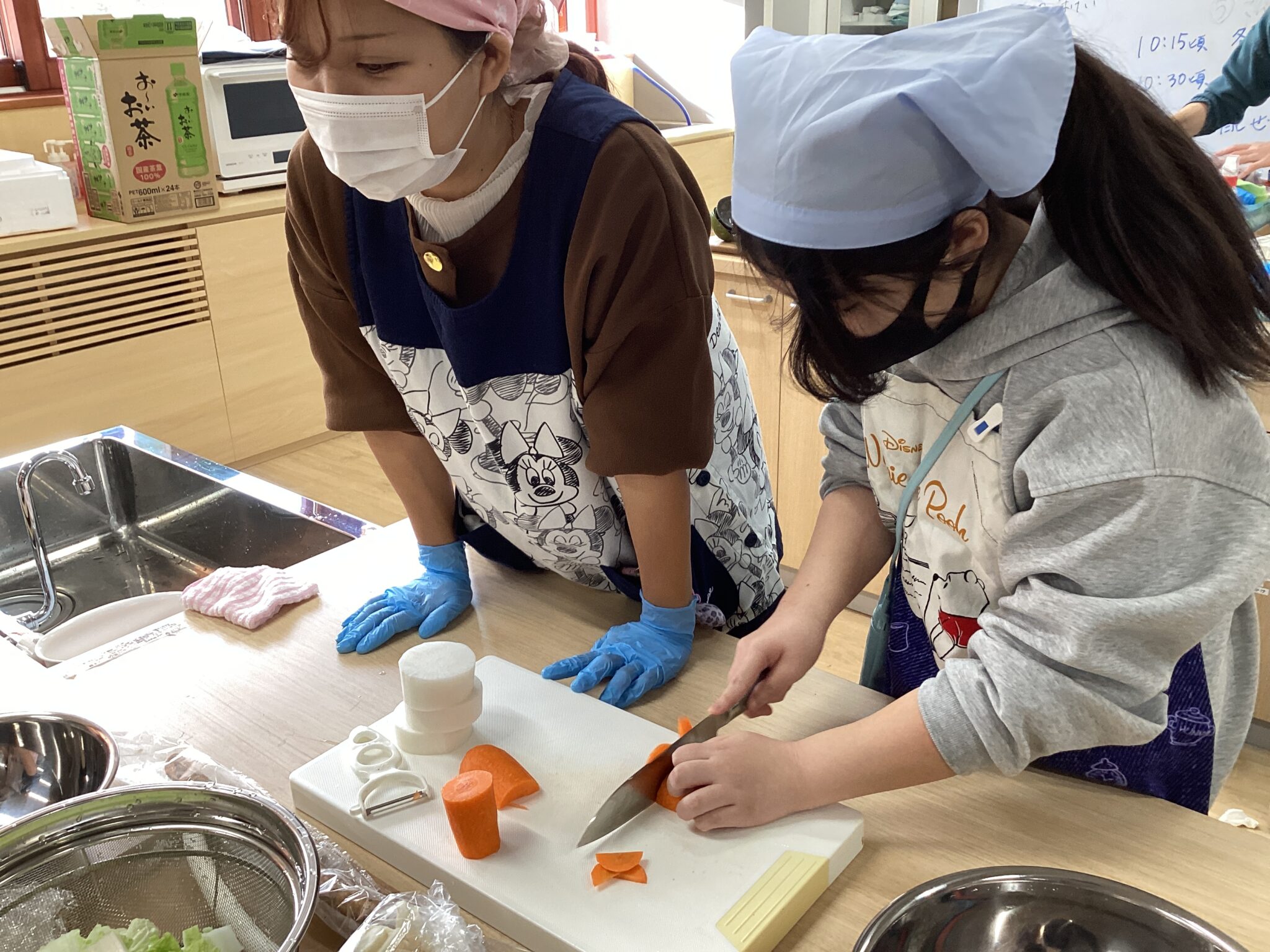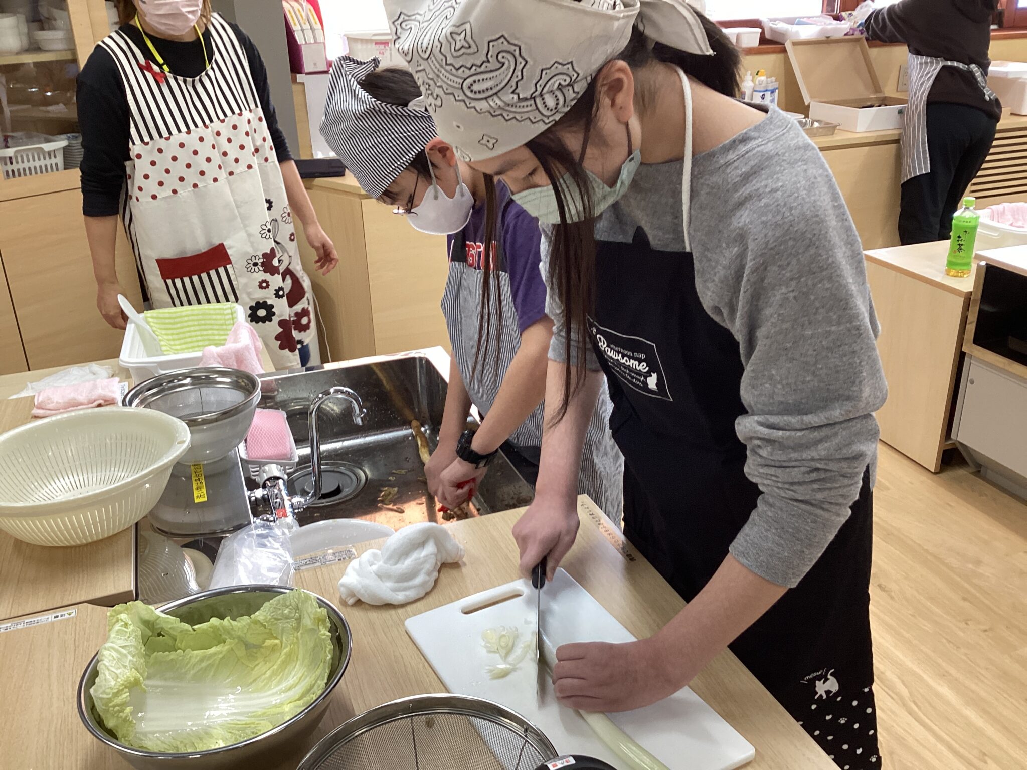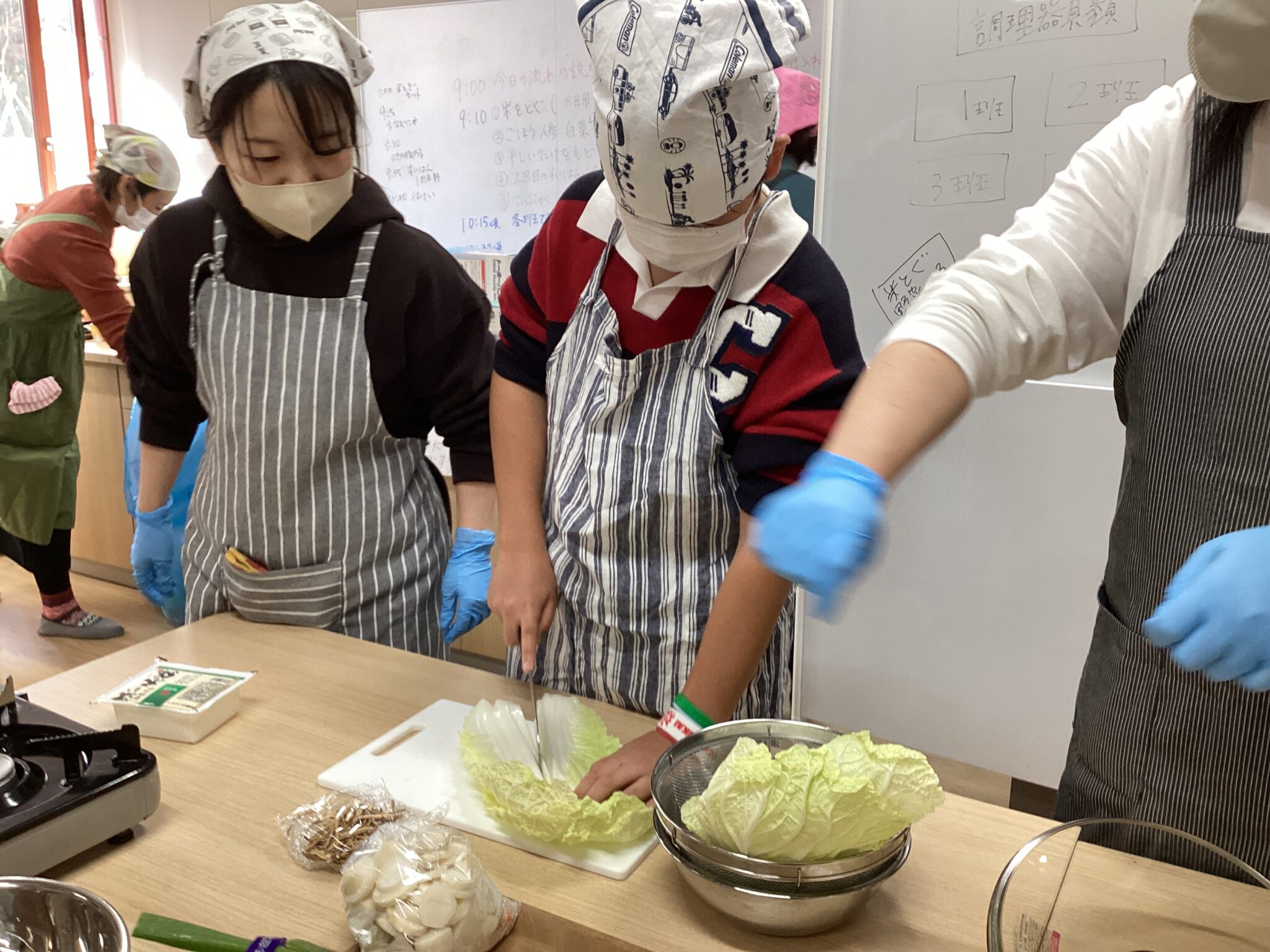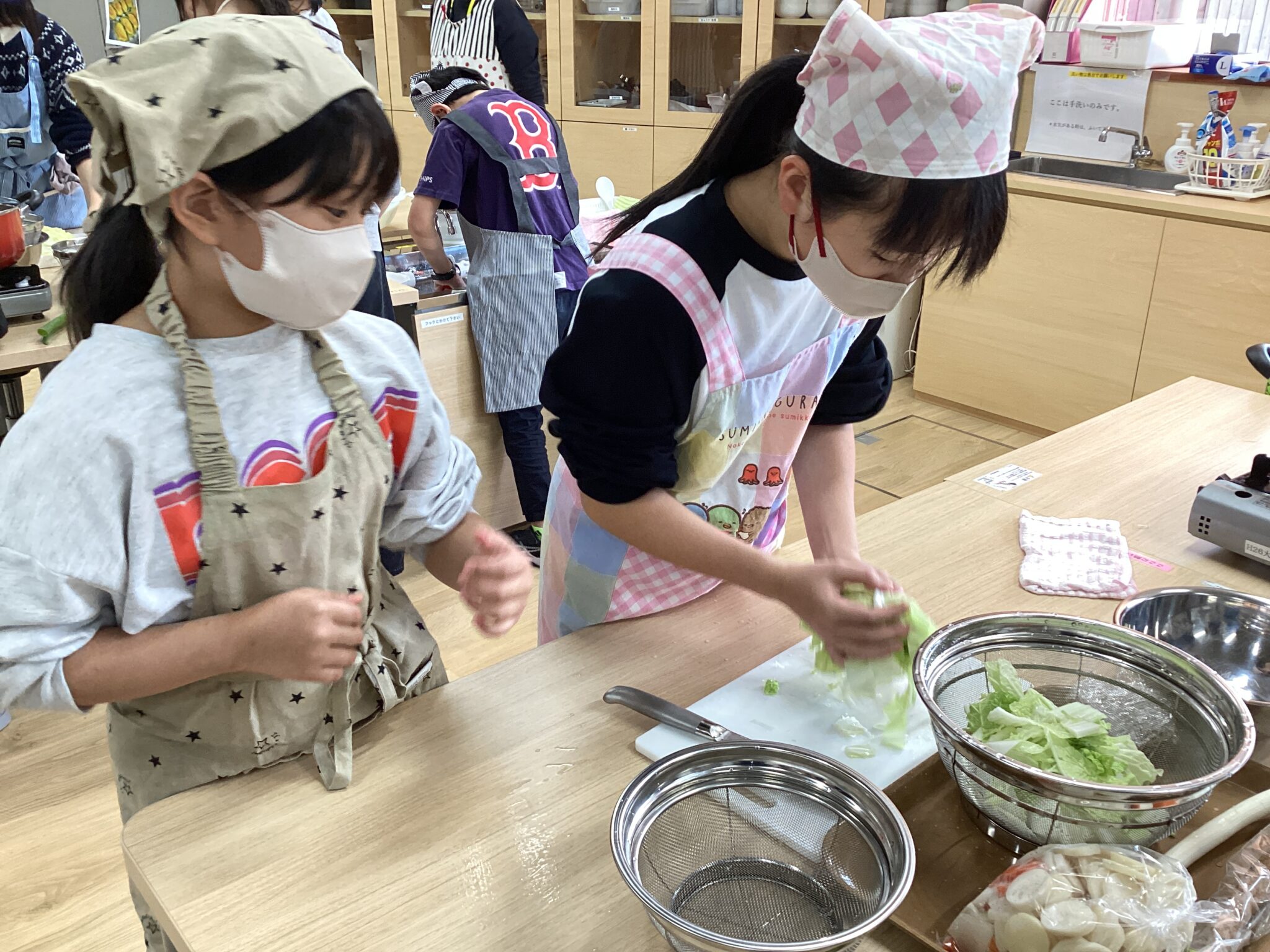 Thanks to the volunteers who started preparing the rice and vegetables and organizing the seasonings in advance, the 5th–9th grade students were able to start cooking smoothly. Meanwhile, the 1st–4th grade students practiced how to serve and welcome the guests.