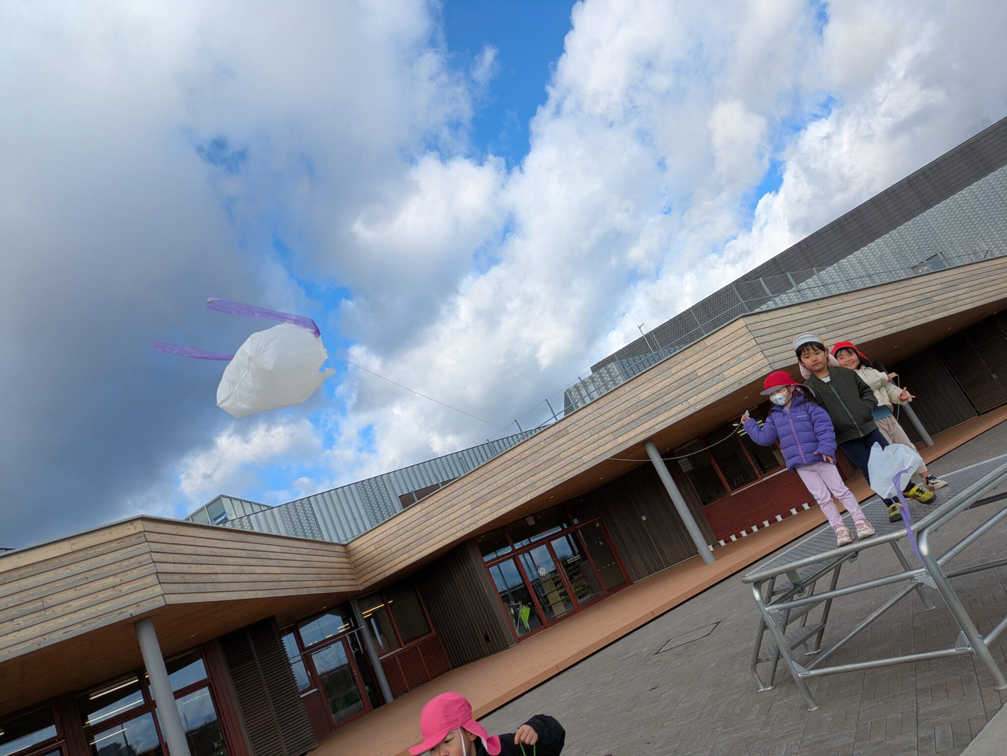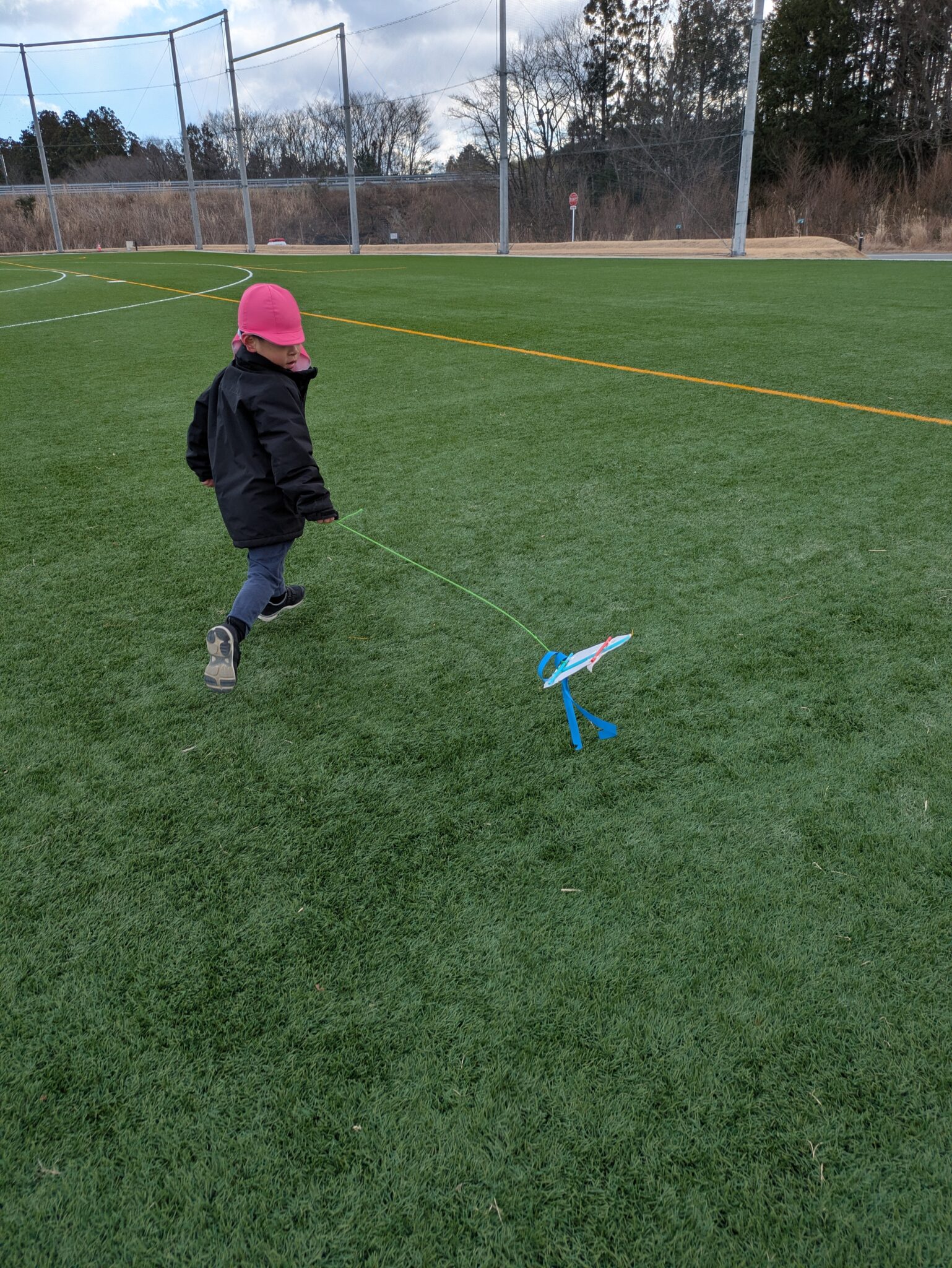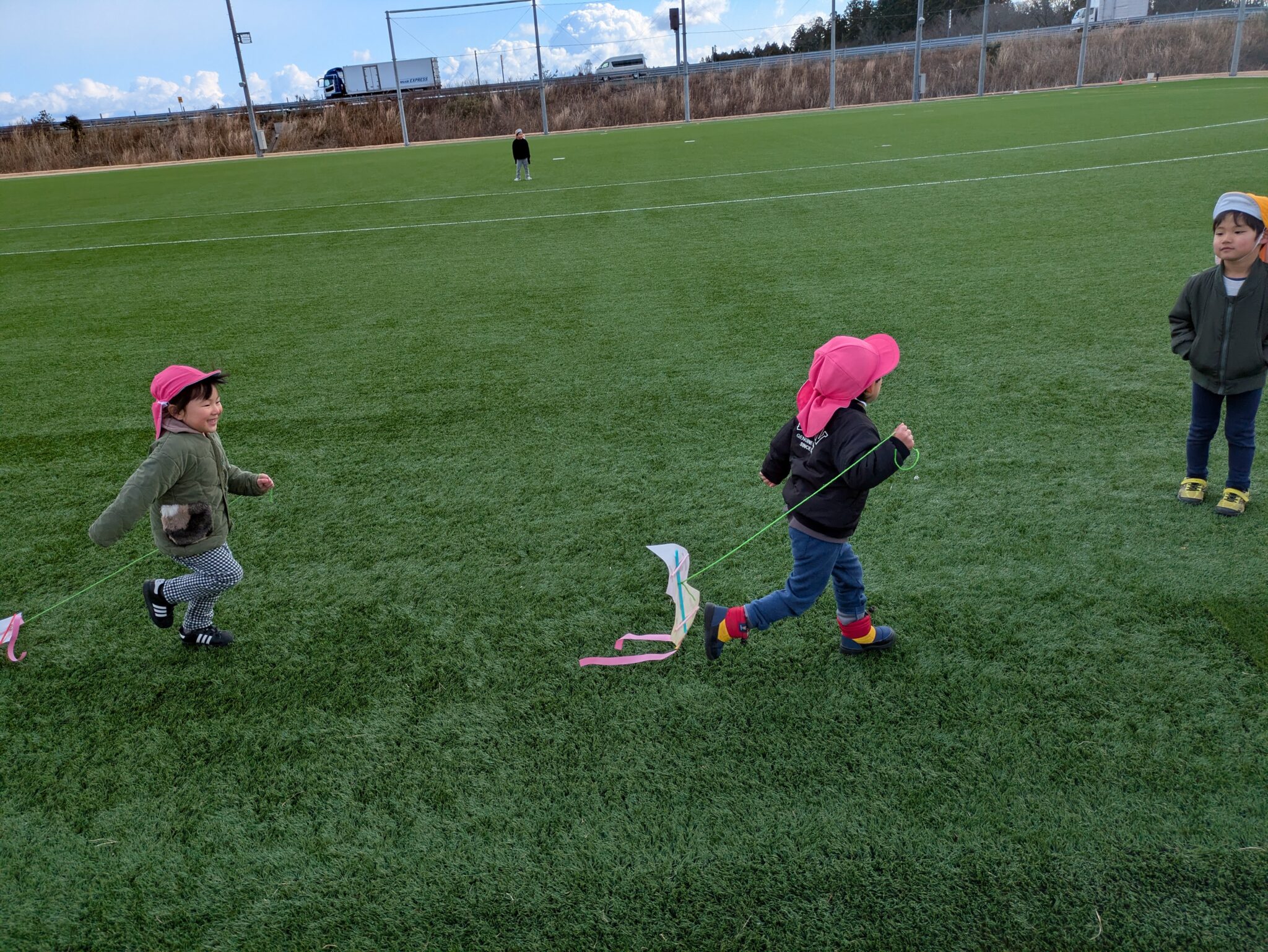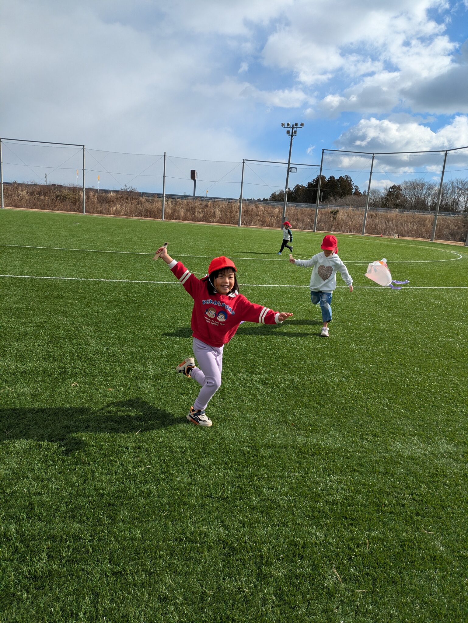 糸を長くすれば絡まるし、風と同じ方向に走れば凧は飛ばない。回数を重ねるごとに飛ばし方が上手になっていました。明日もやろうね!と約束し、寒さに負けず走り回る子どもたちです。