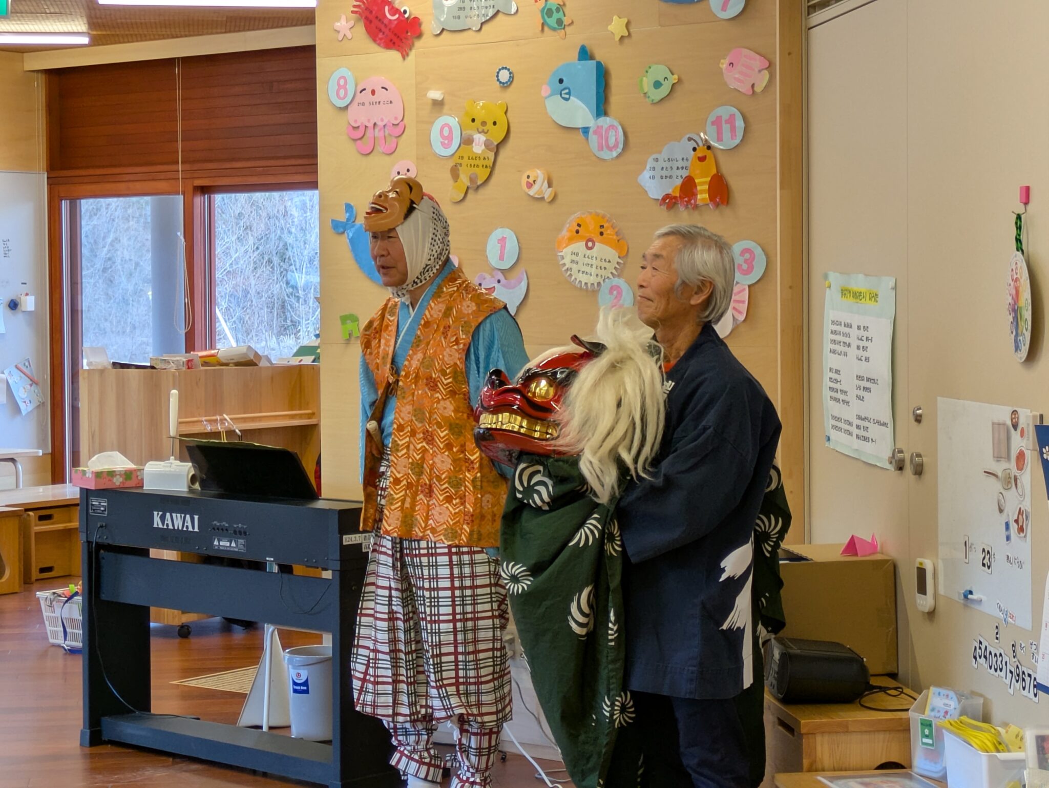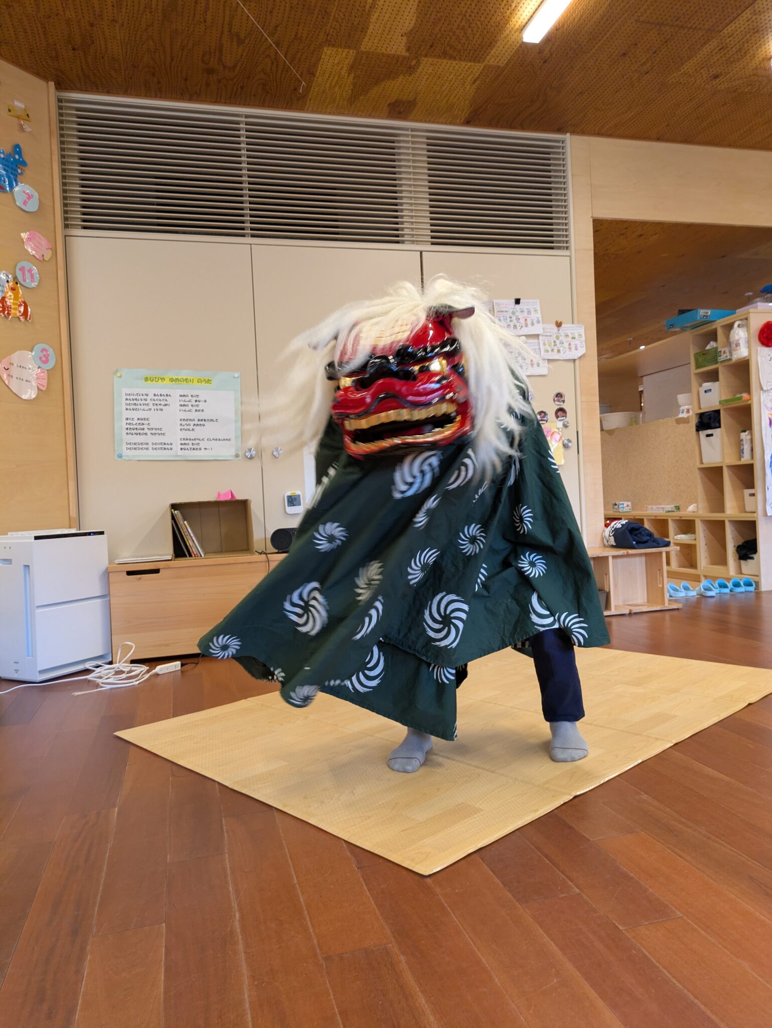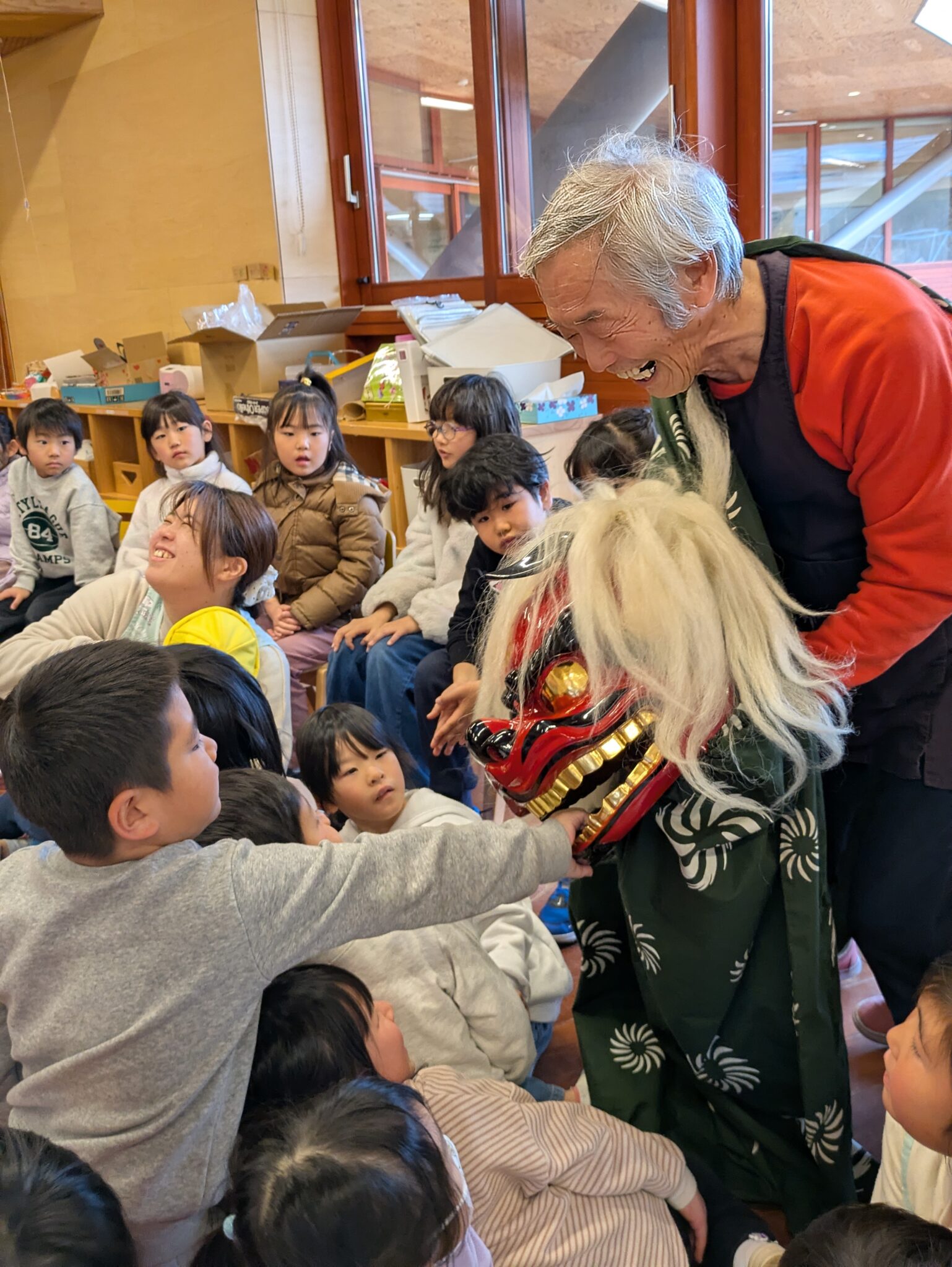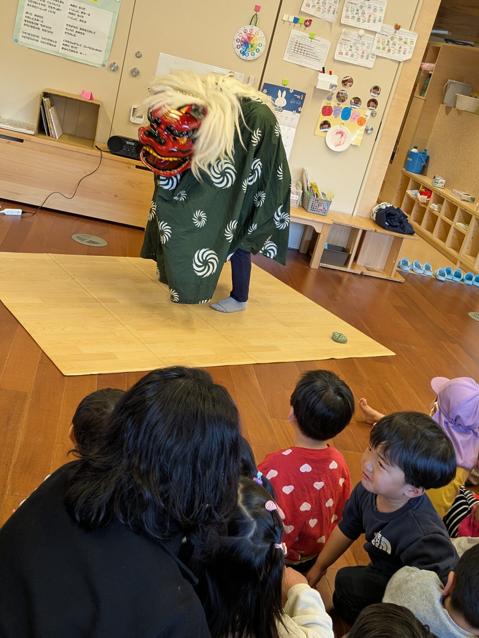 獅子舞って何?とお正月の絵本を読み聞かせを行い、怖いものではないということを伝え、いざ登場☆