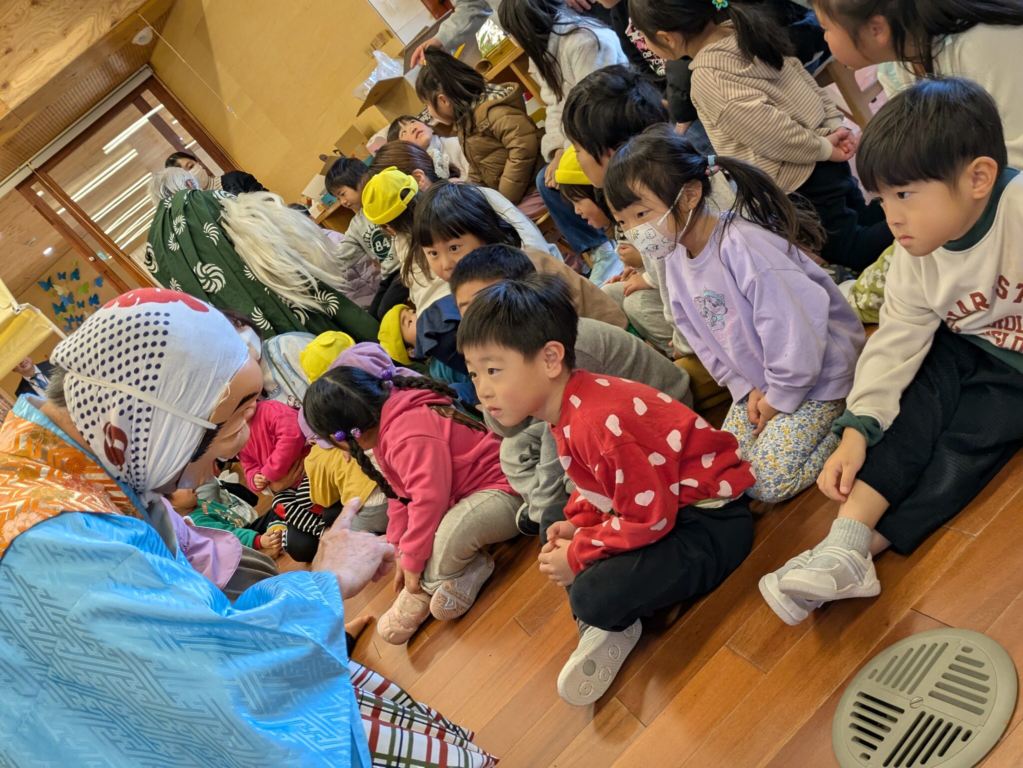 節分の鬼と勘違いしている子が若干名いまして、「え??怖い!!」「やだぁ」と腰が引けたり、後ろに座ろうとしたり…